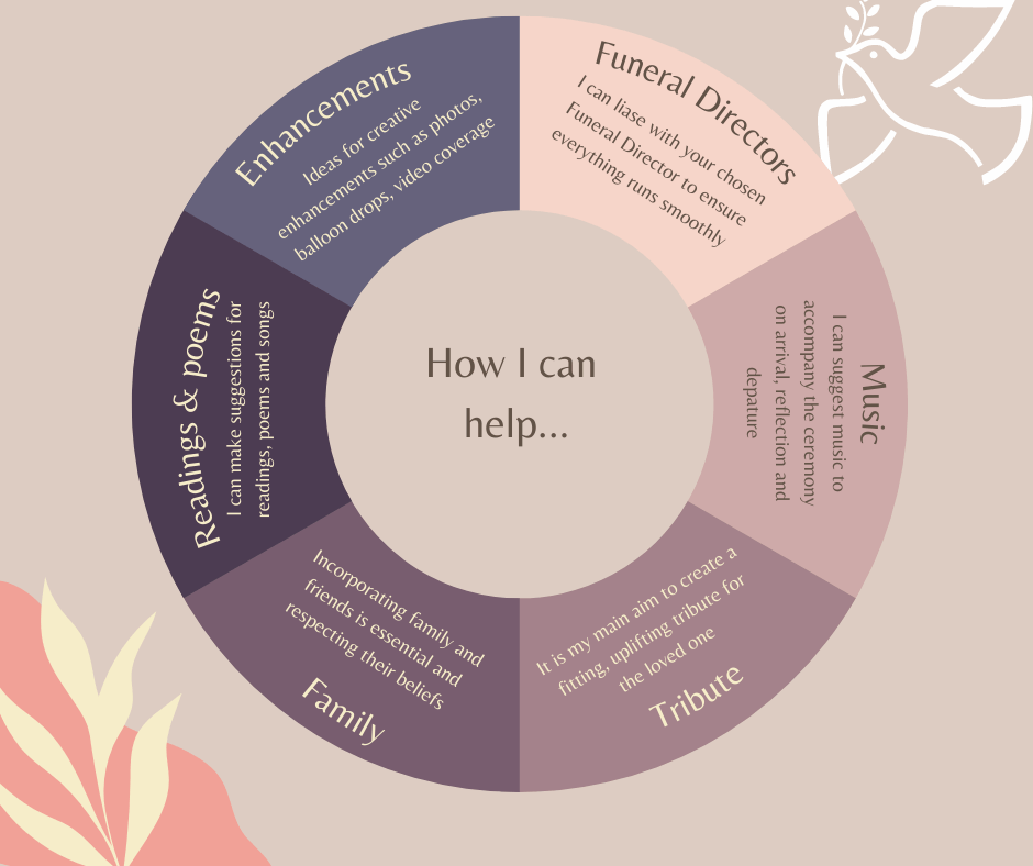 - Creating a fitting, uplifting tribute for the loved one incorporating family, friends and special interests, always respecting beliefs